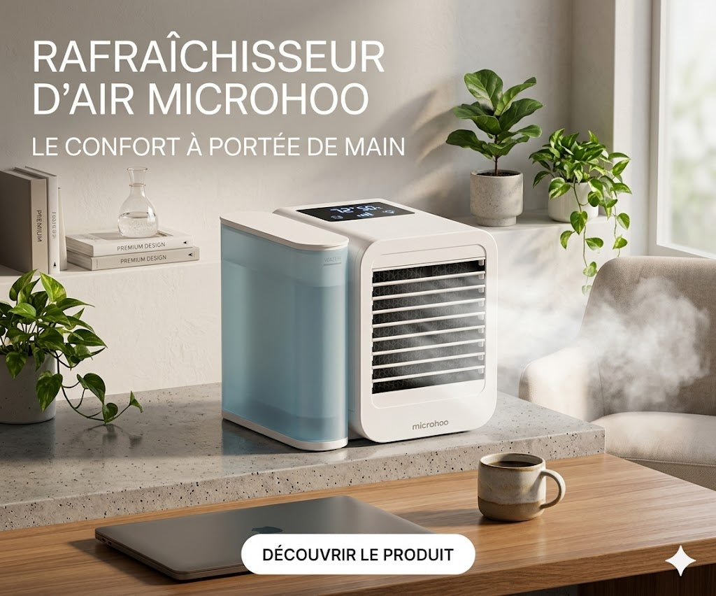 Climatiseur portatif Microhoo : fraîcheur rapide et efficace.Compact, léger et facile à déplacer partout.Silencieux, idéal pour un usage quotidien.